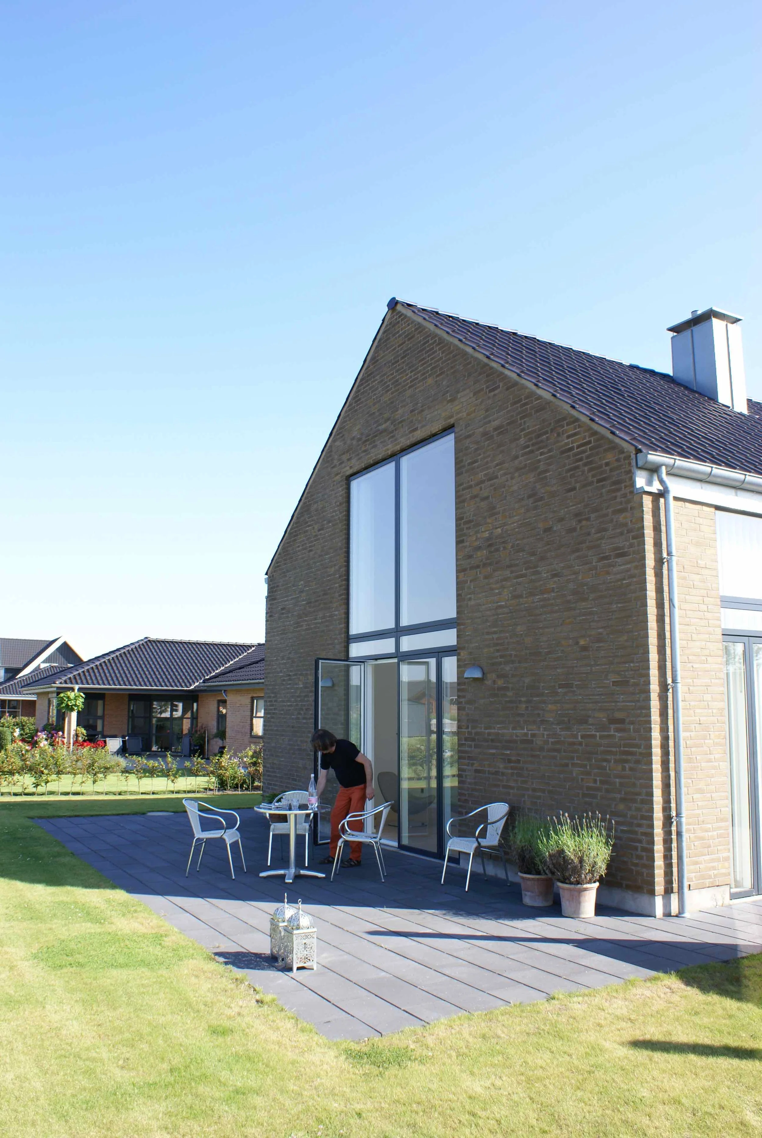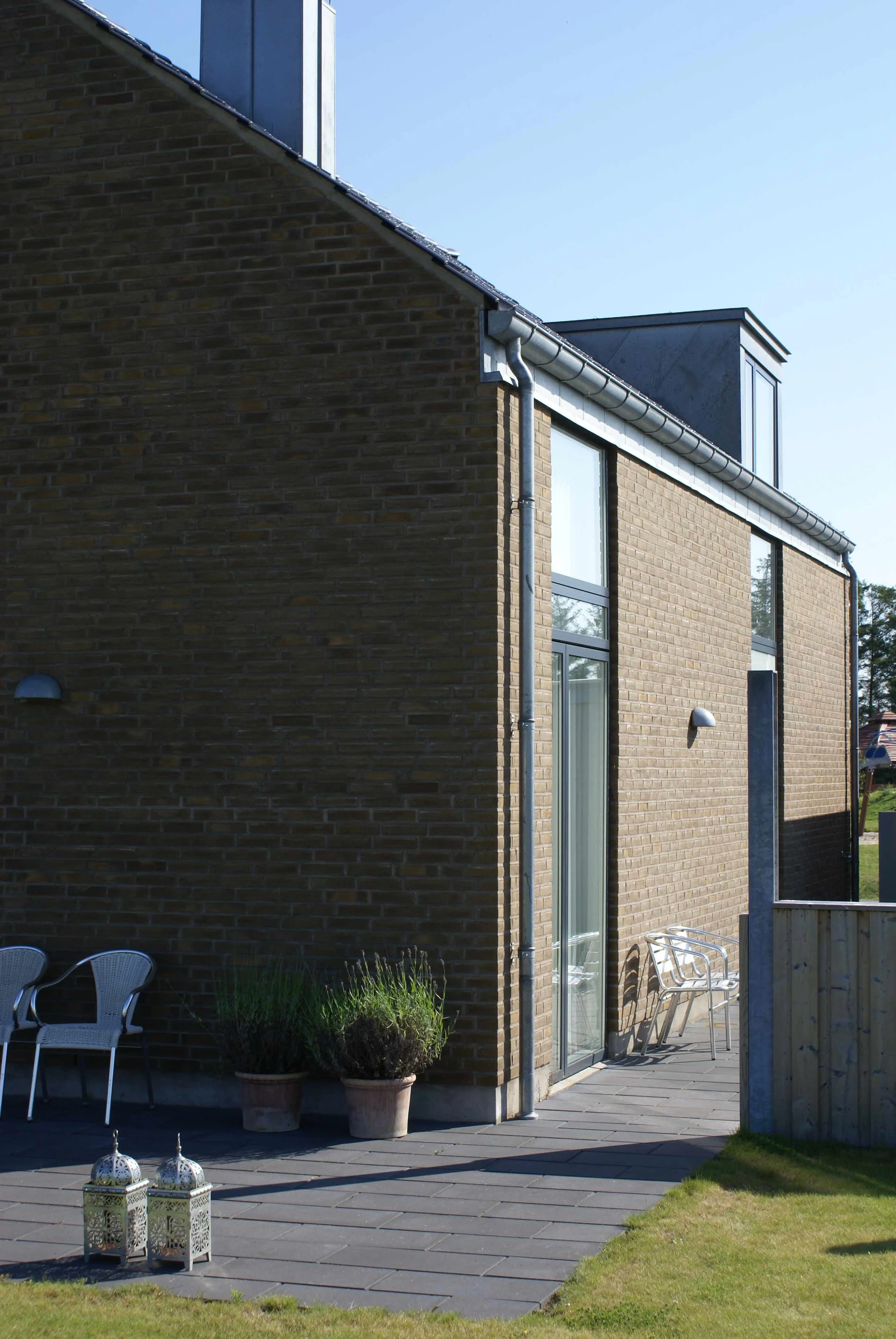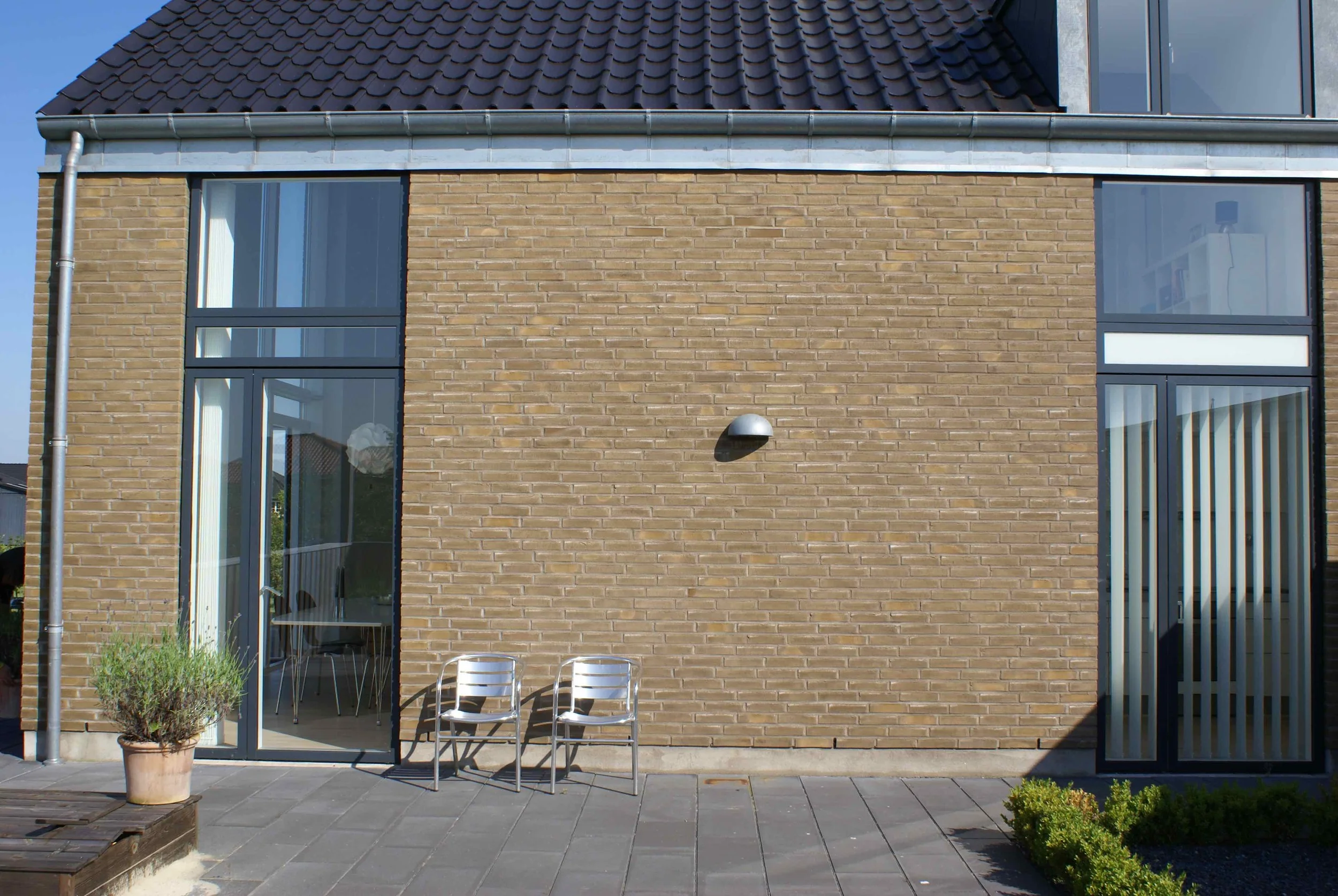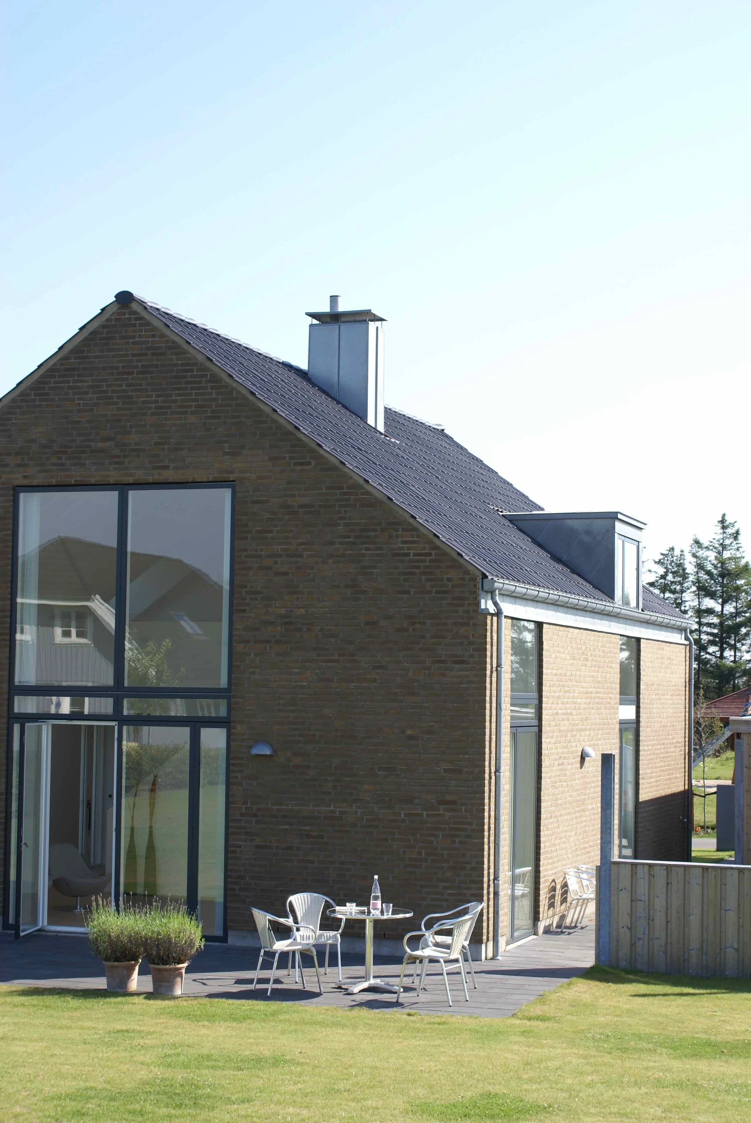 Vi nyder huset, som på alle måder lever op til vores forventninger. De mange vinduer giver masser af lys (og varme) og de mange døre til terrasserne står åbne fra tidligt forår til efterårets komme. Arkitekturen bag huset sikrer at alt blive inddraget, der er ikke en krog indendørs eller udendørs der ikke bliver brugt.