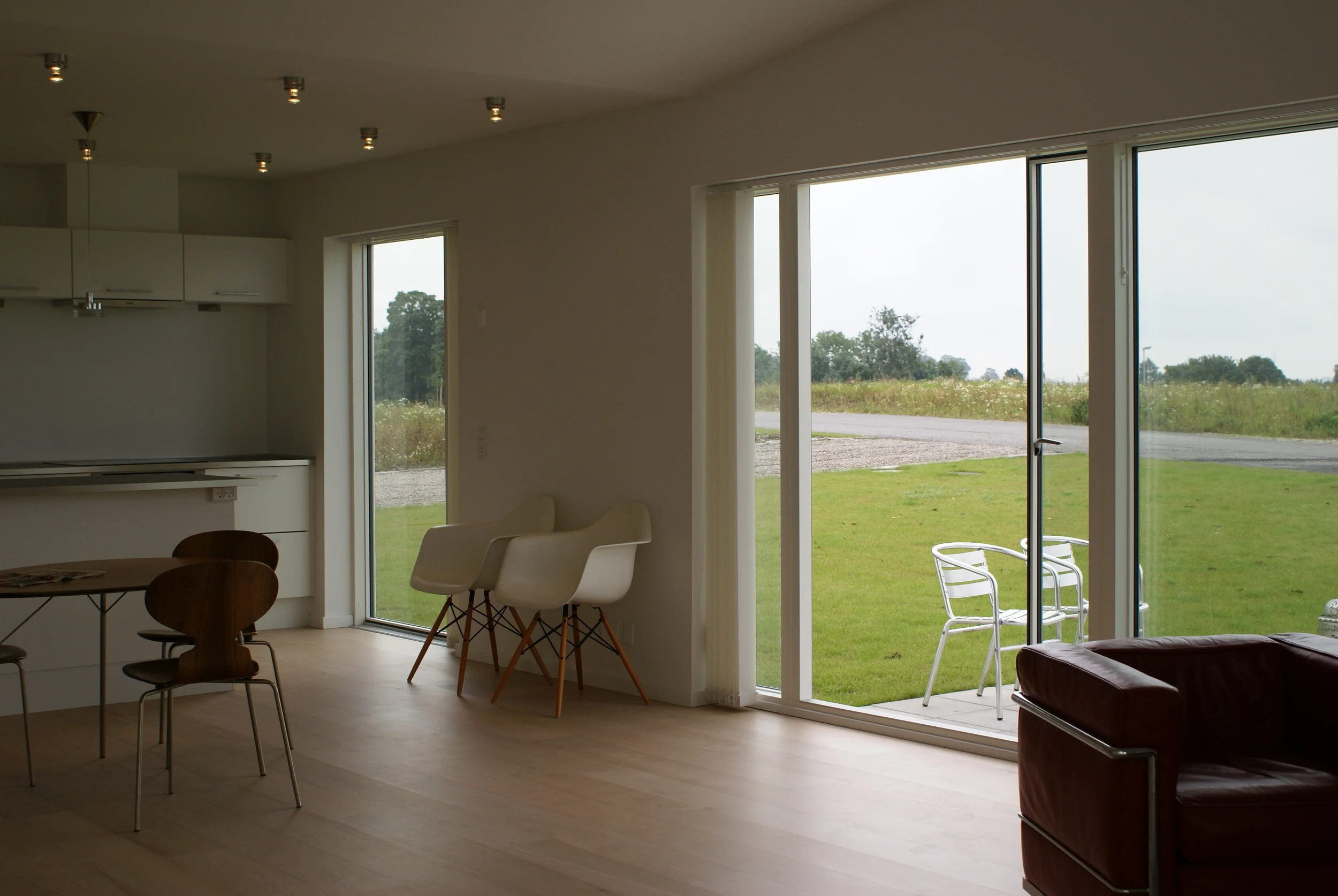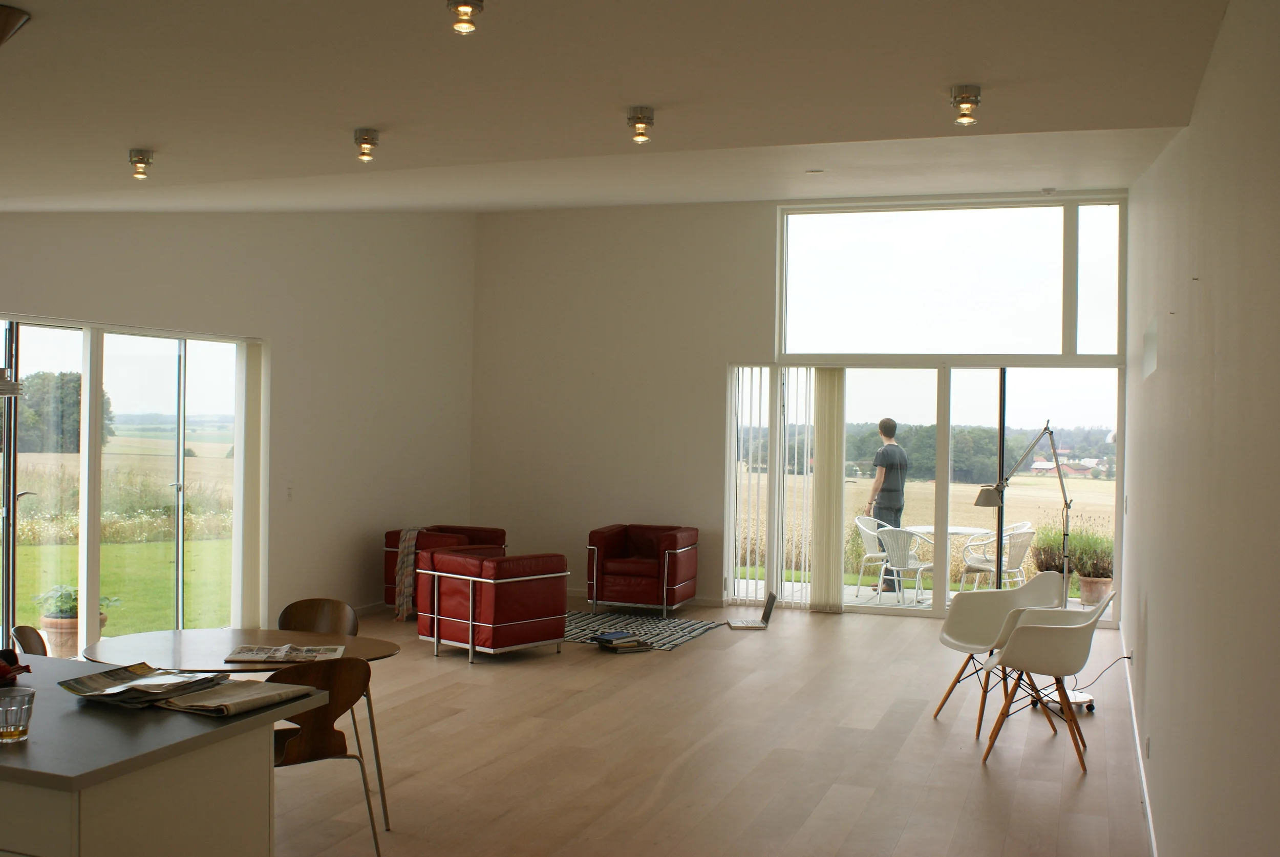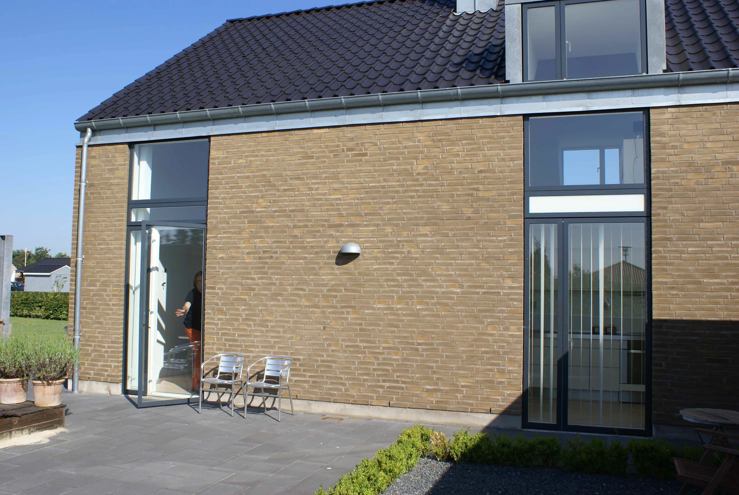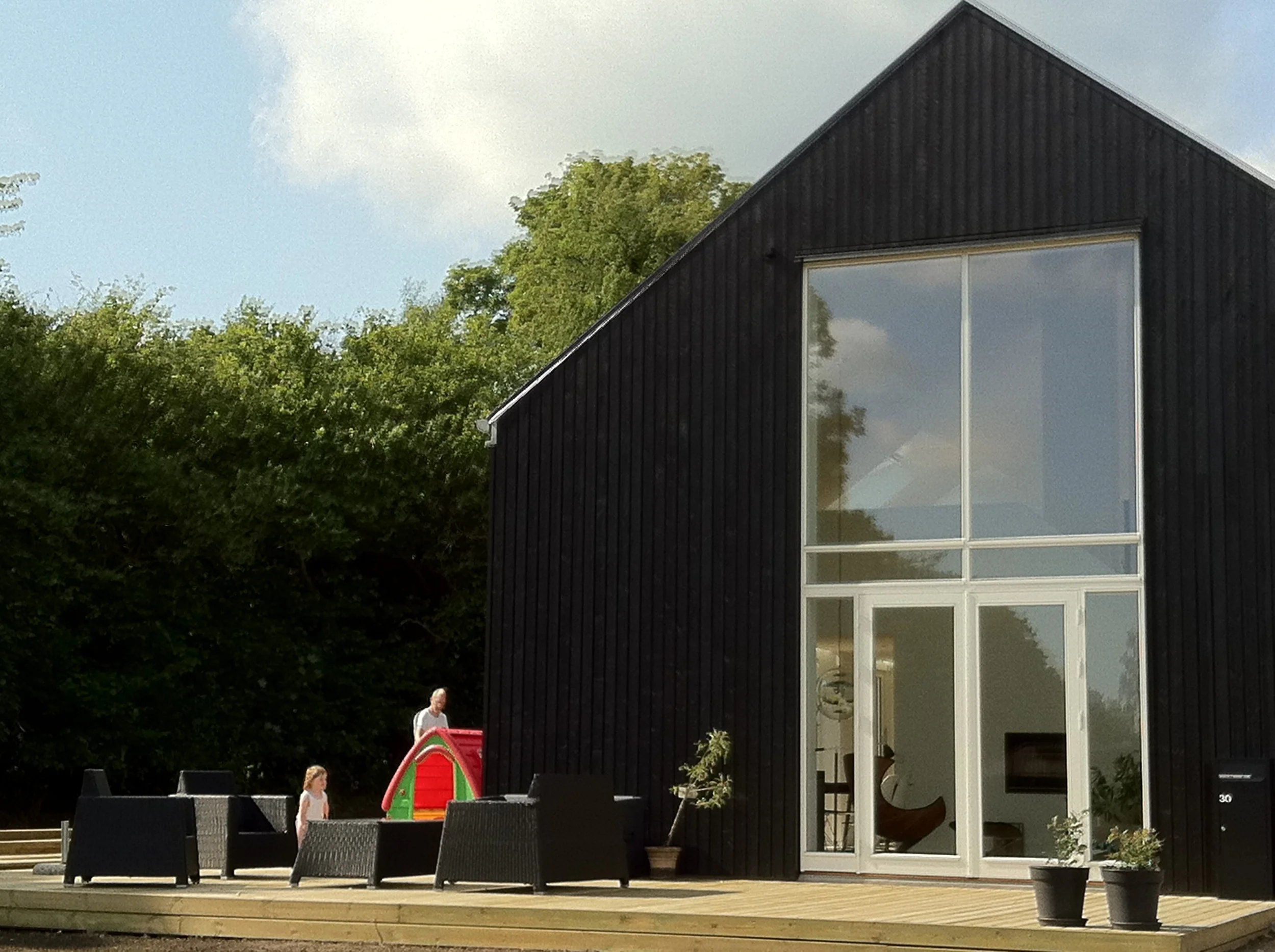 Vi nyder huset, som på alle måder lever op til vores forventninger. De mange vinduer giver masser af lys (og varme) og de mange døre til terrasserne står åbne fra tidligt forår til efterårets komme. Arkitekturen bag huset sikrer at alt blive inddraget, der er ikke en krog indendørs eller udendørs der ikke bliver brugt.