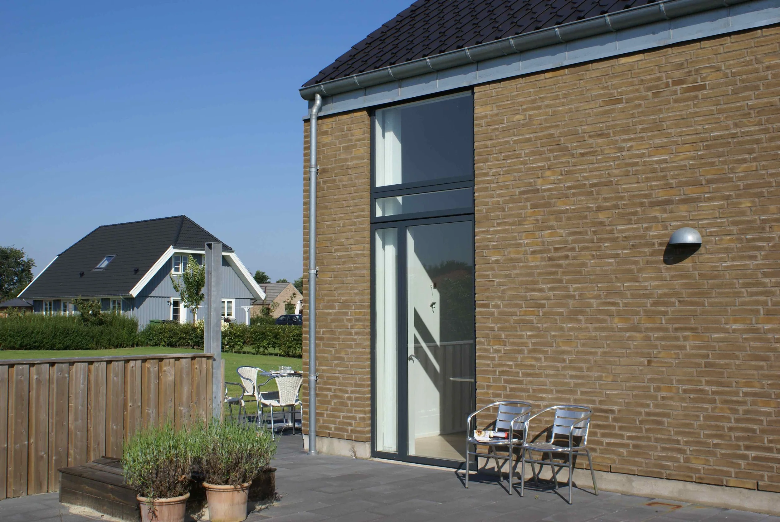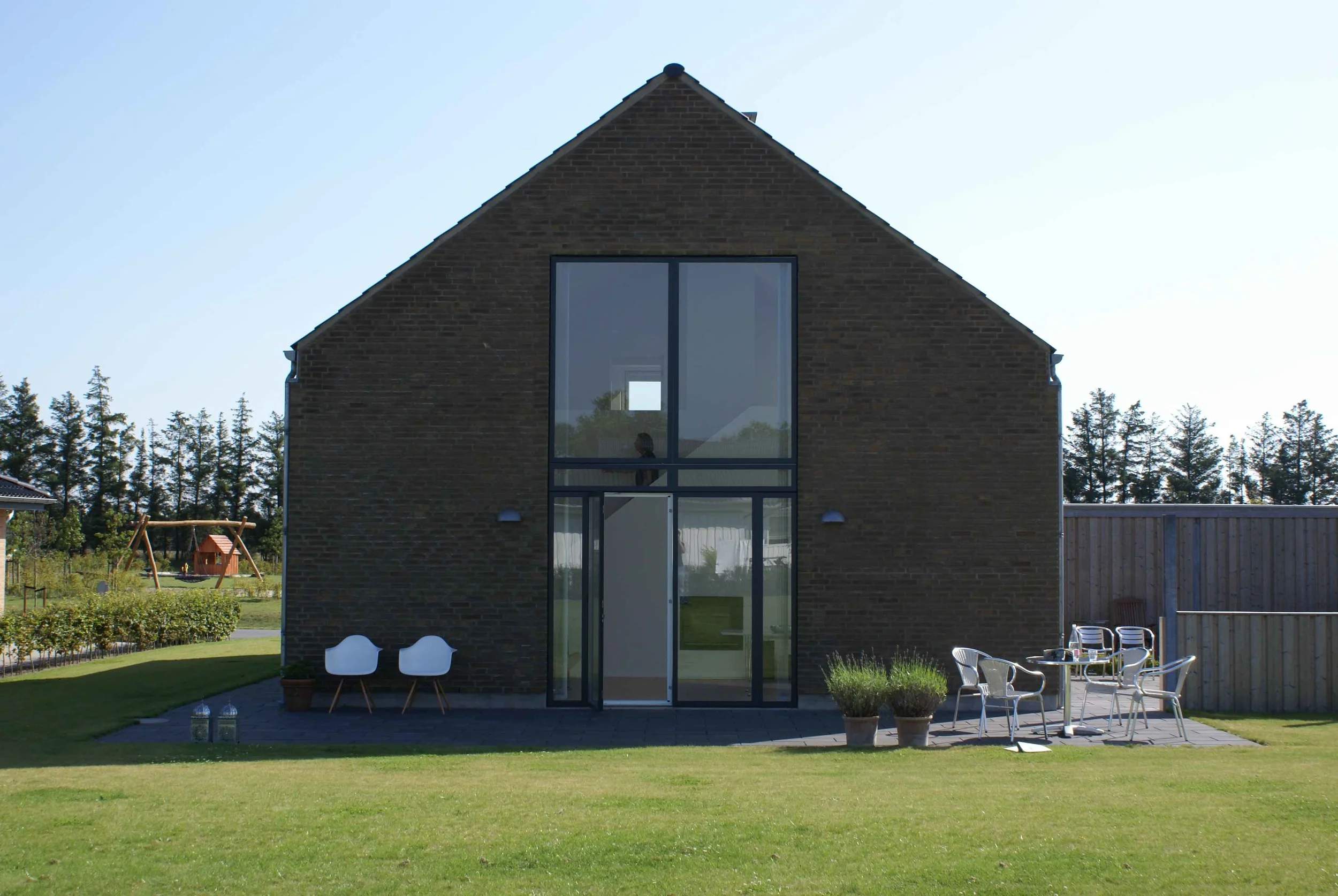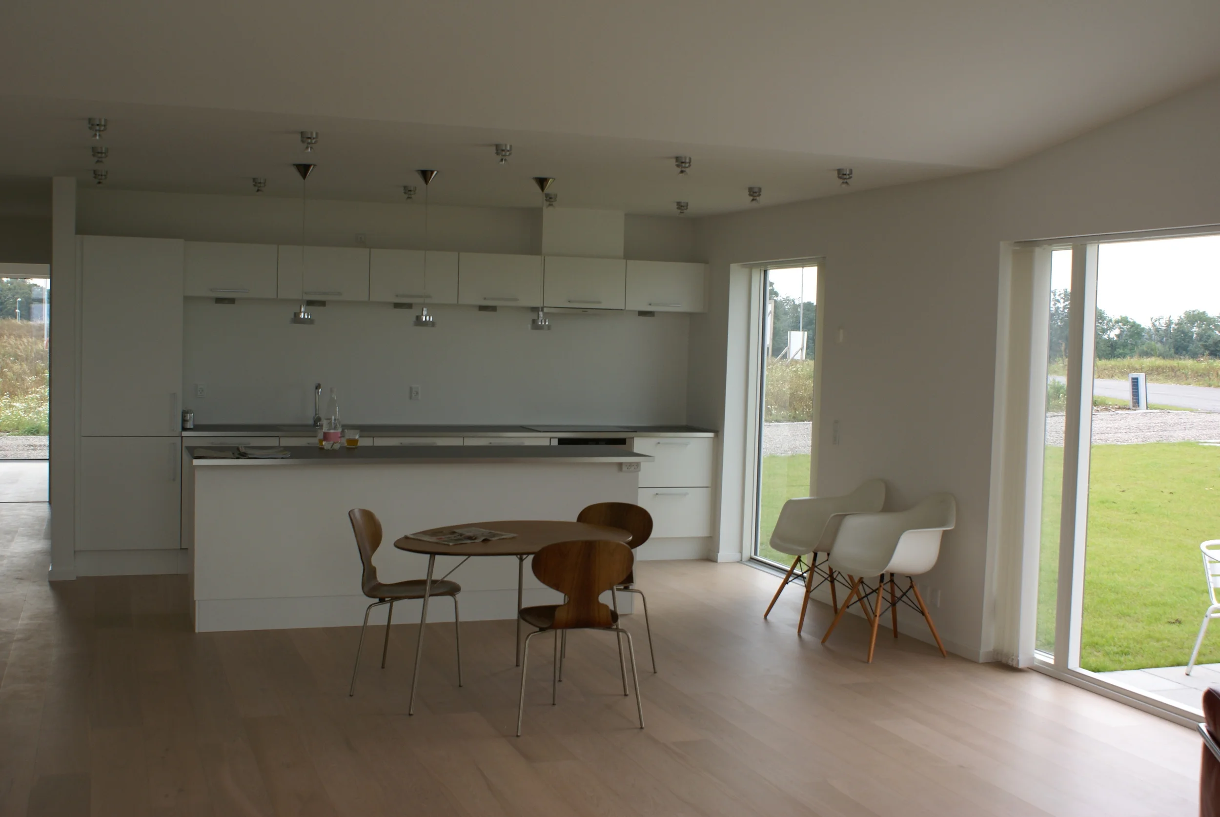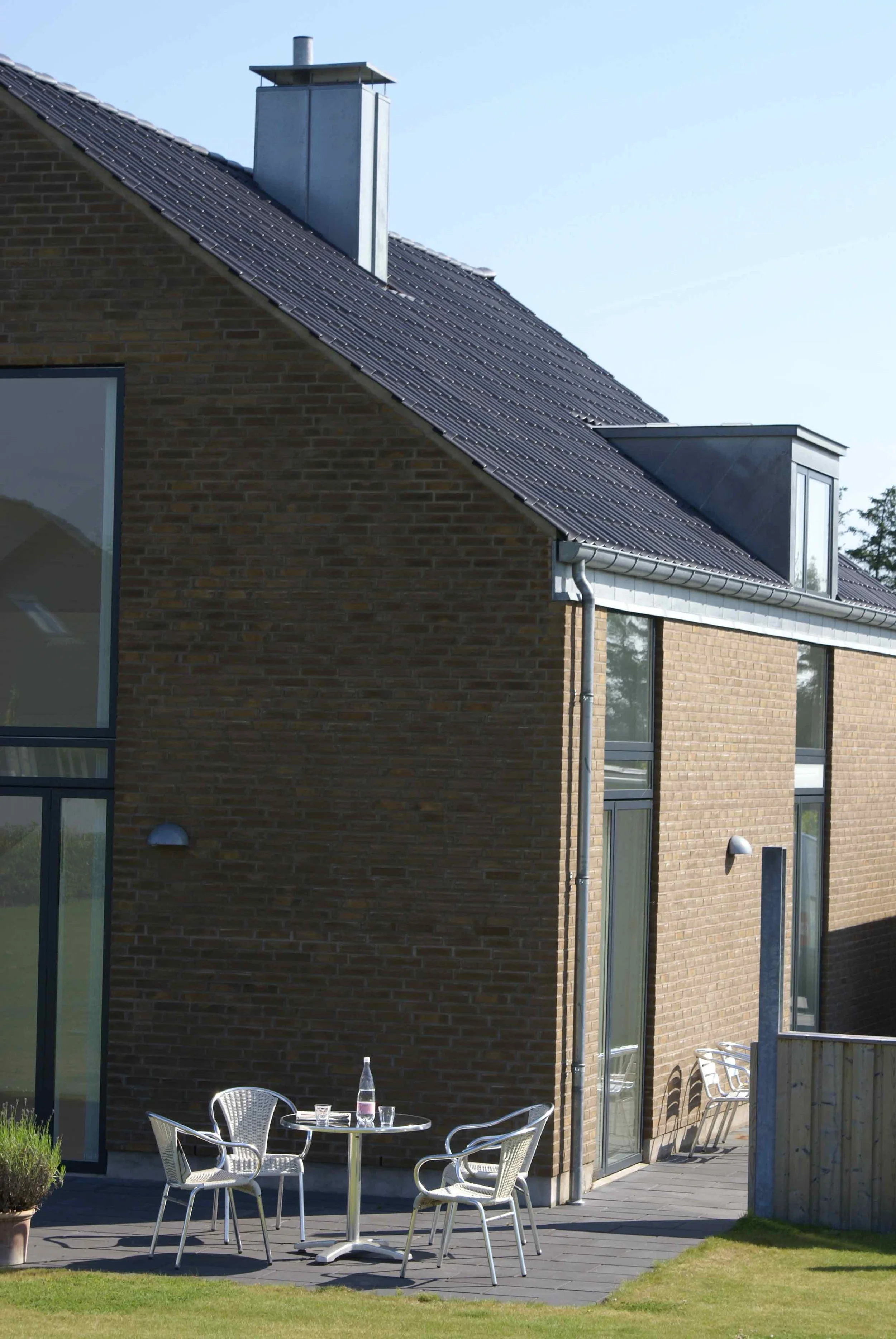 Vi nyder huset, som på alle måder lever op til vores forventninger. De mange vinduer giver masser af lys (og varme) og de mange døre til terrasserne står åbne fra tidligt forår til efterårets komme. Arkitekturen bag huset sikrer at alt blive inddraget, der er ikke en krog indendørs eller udendørs der ikke bliver brugt.