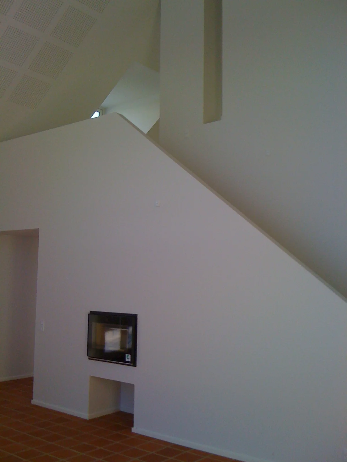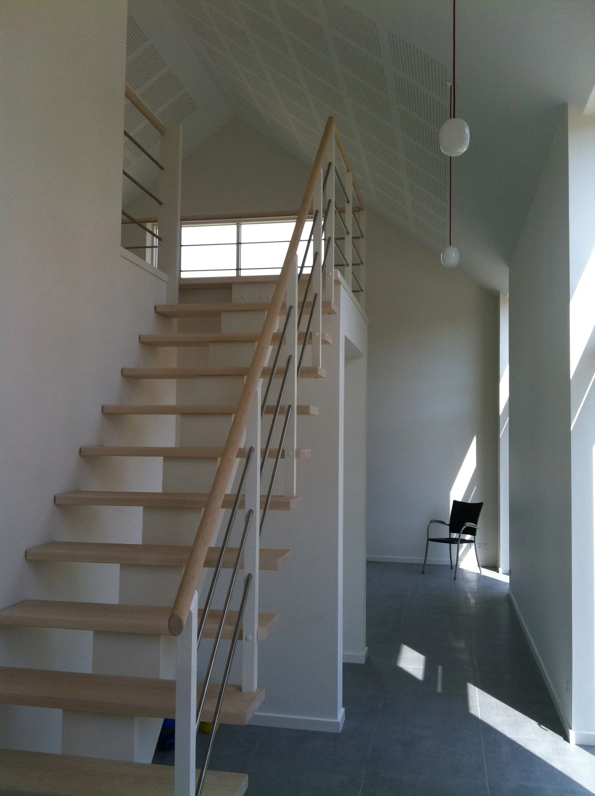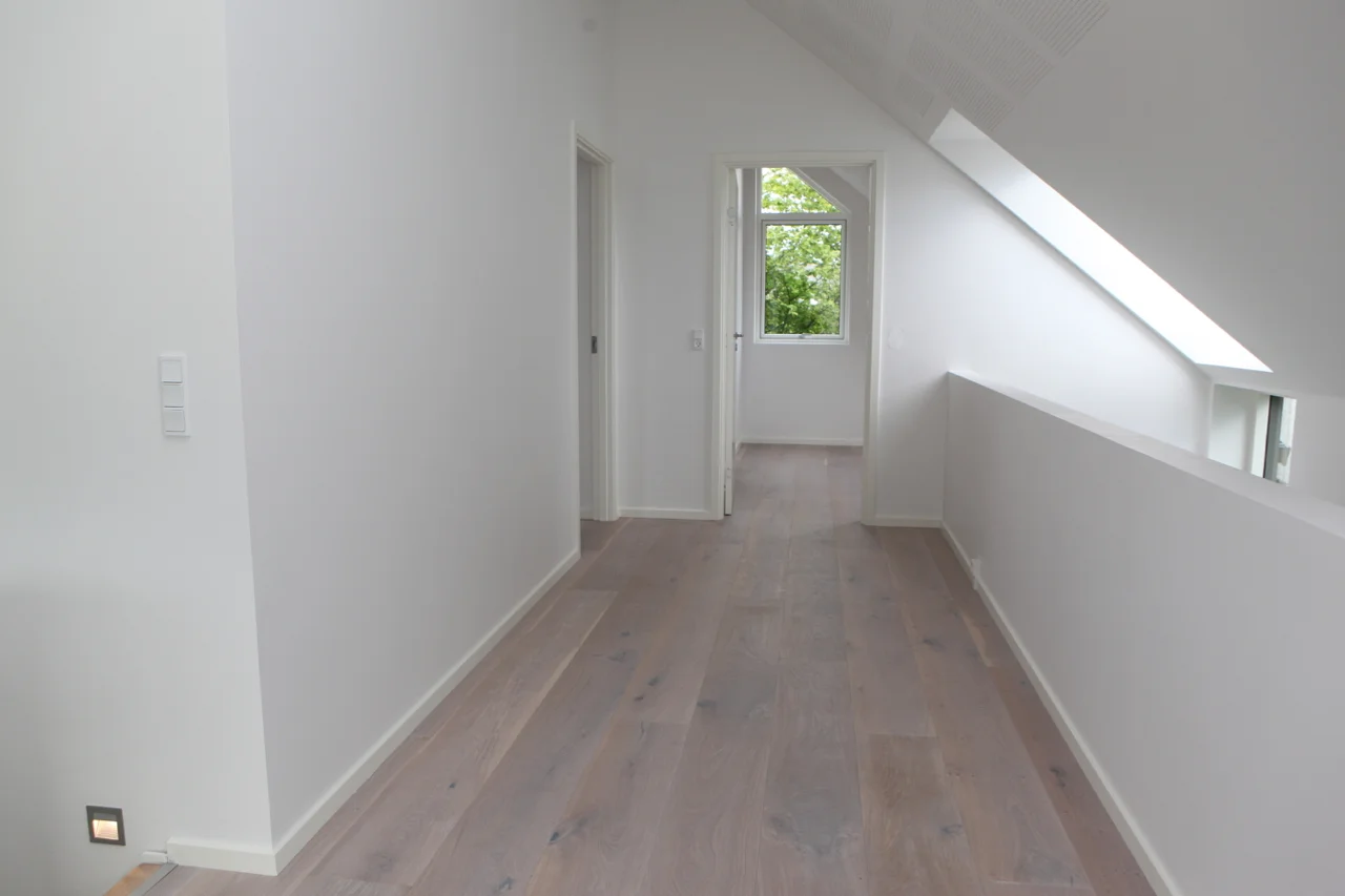 Første salen nås via trappen. denne flankeres af et vægstykke, der visuelt opdeler allroom fra opholdsstuen. På øverste plan er der 2 værelser, walkin og badeværelse. Disse rum betjenes via gangbroen hen over spisestuen / allroom. Derudover, er der i forbindelse med balkonen, en stue til arbejds relateret ophold og naturligvis almindelig fornøjelse.