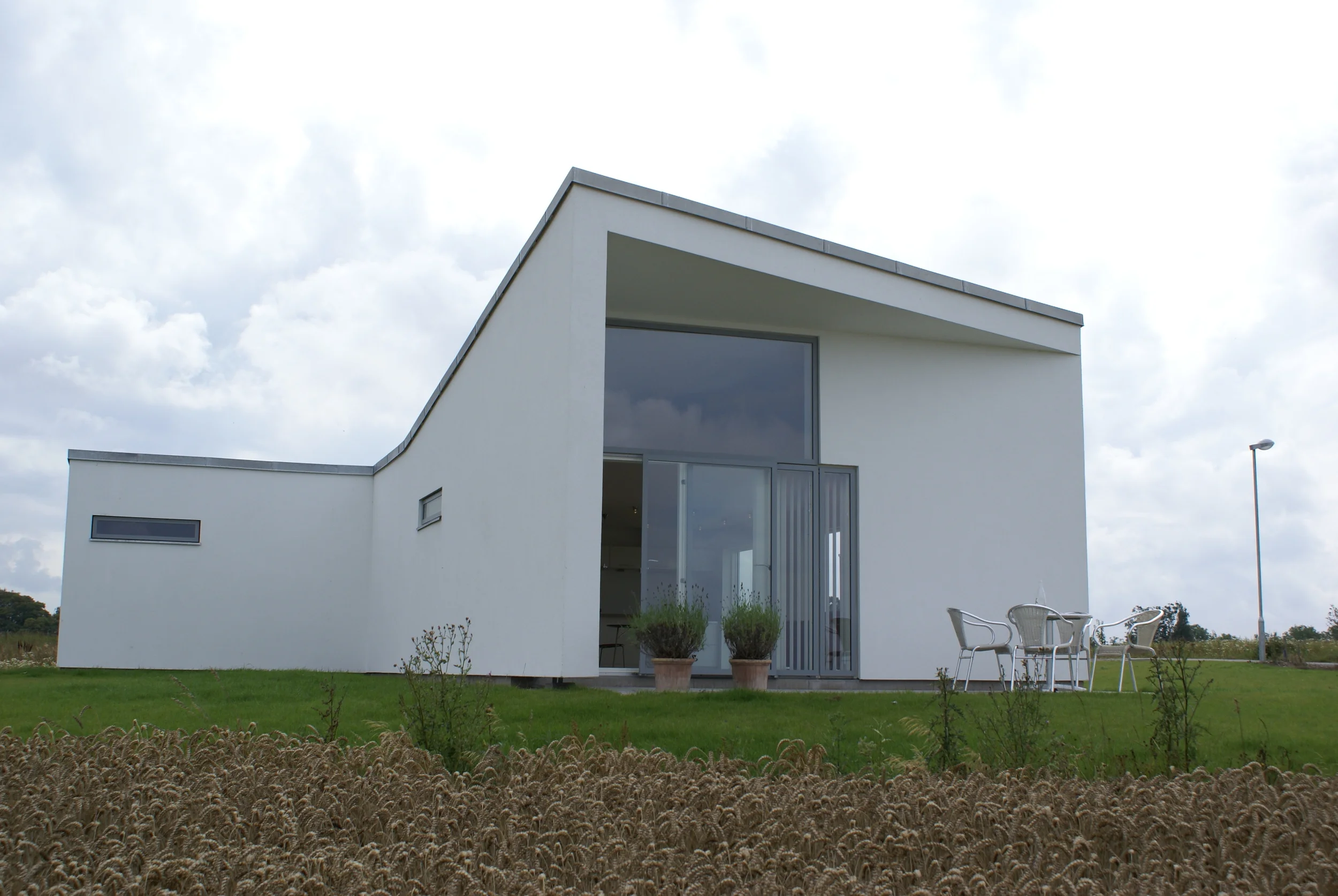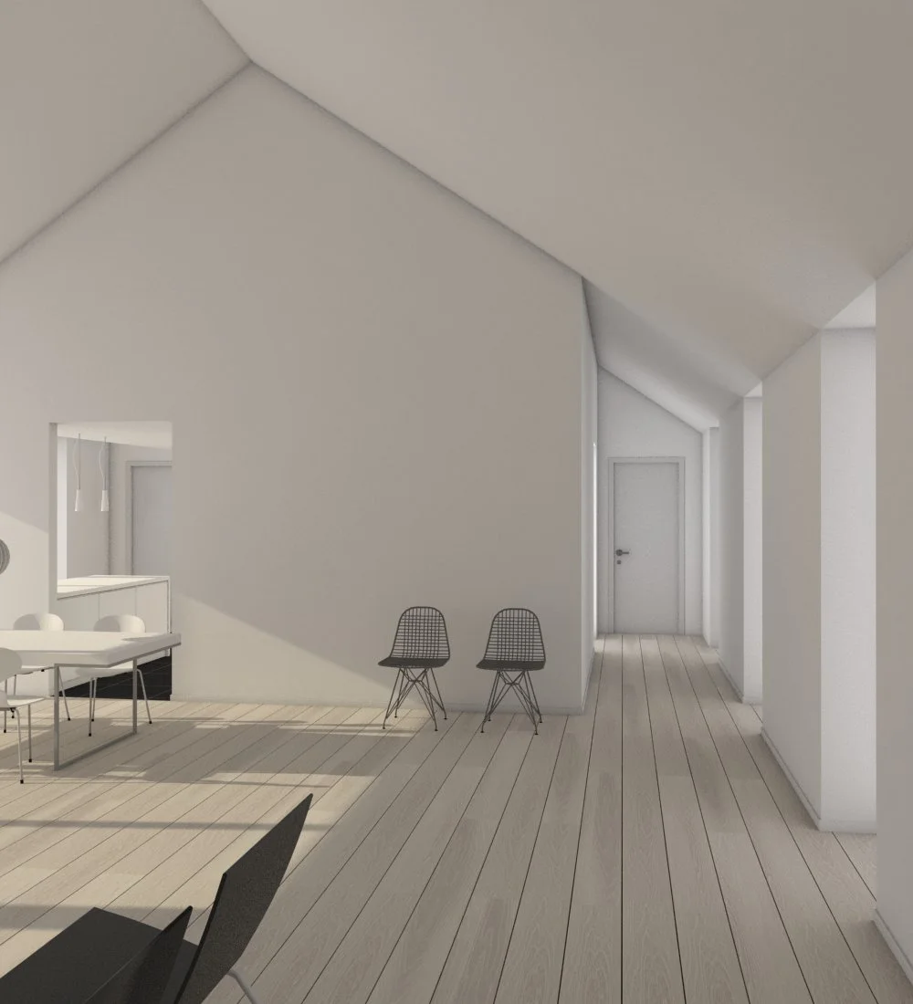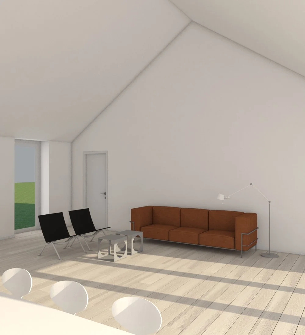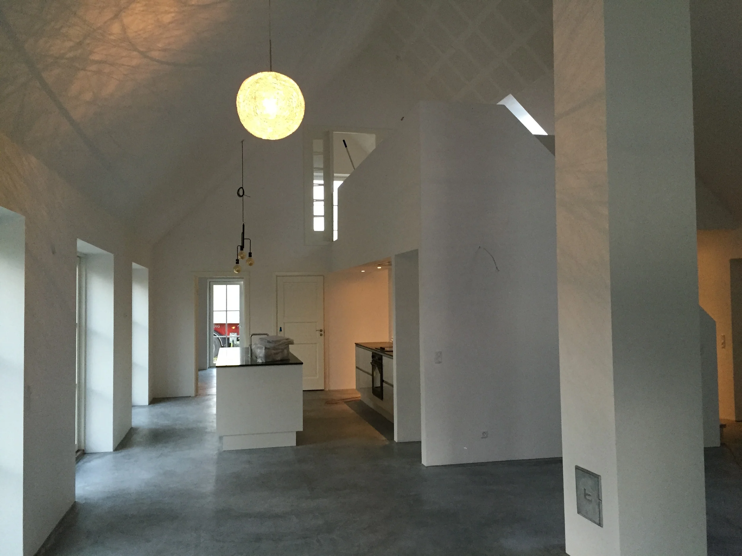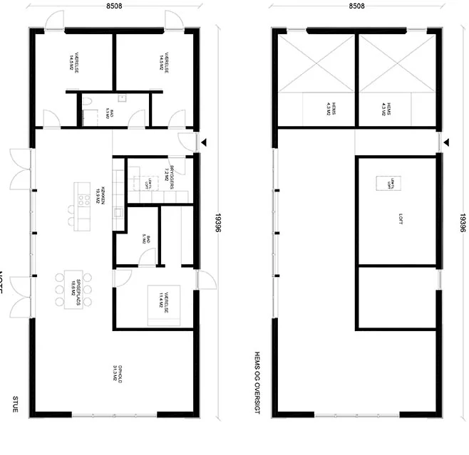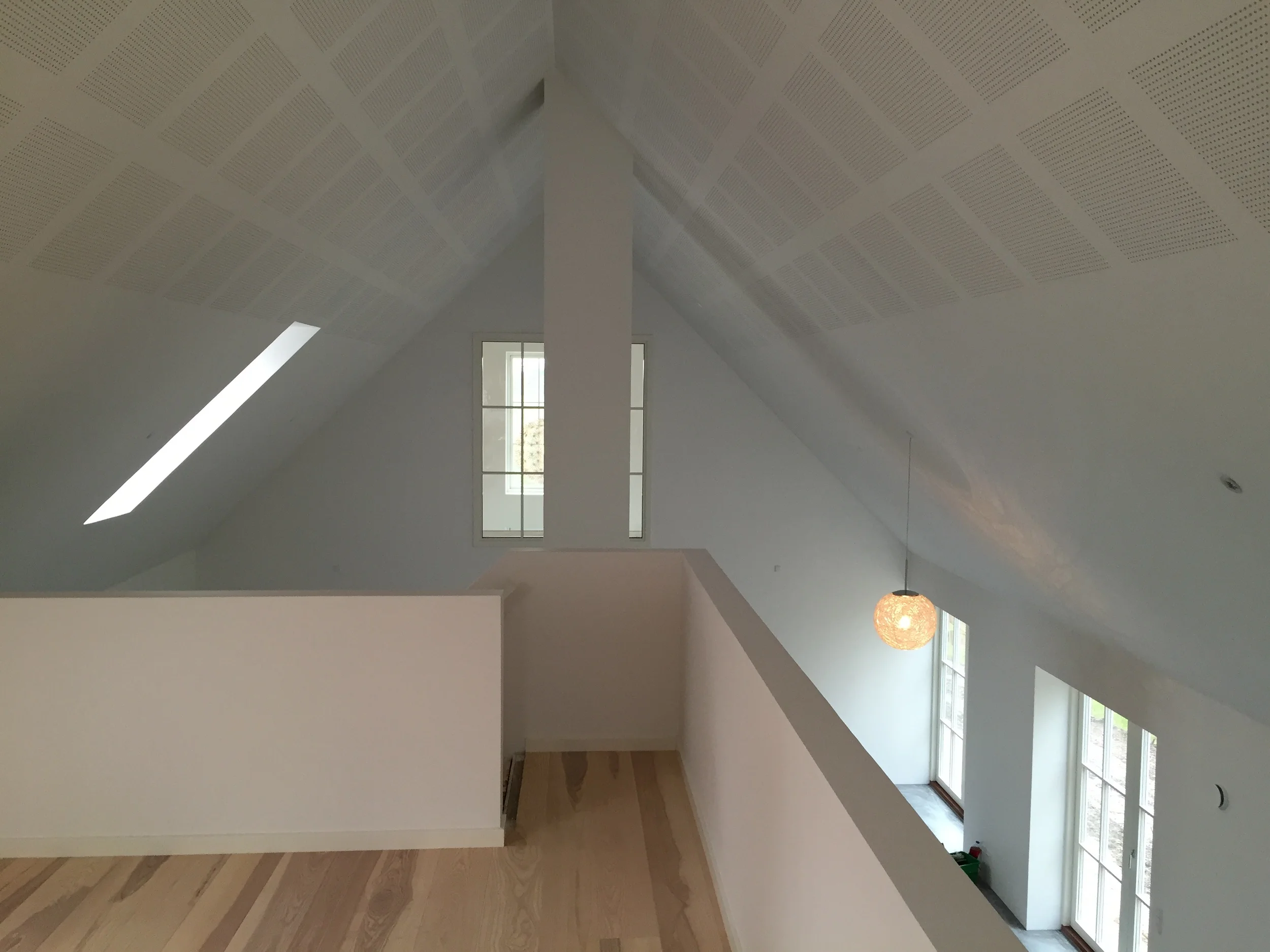 Som udgangspunkt for huset er det typen oneroom one, som altid modificeret og justeret. Huset er opført med en højere rejsning på taget, så det giver plads til arbejdsrum og kontor på første sal. Stadig opfattes rummende som sammenhængende, dog grundet det lukkede værn, alligevel adskilte, i en grad, så det giver arbejdsro på øvre plan. Set som hele, er det et hus med store sammenhængende rum, i den grad, med højt til loftet, men stadig hyggeligt og lidt landligt...