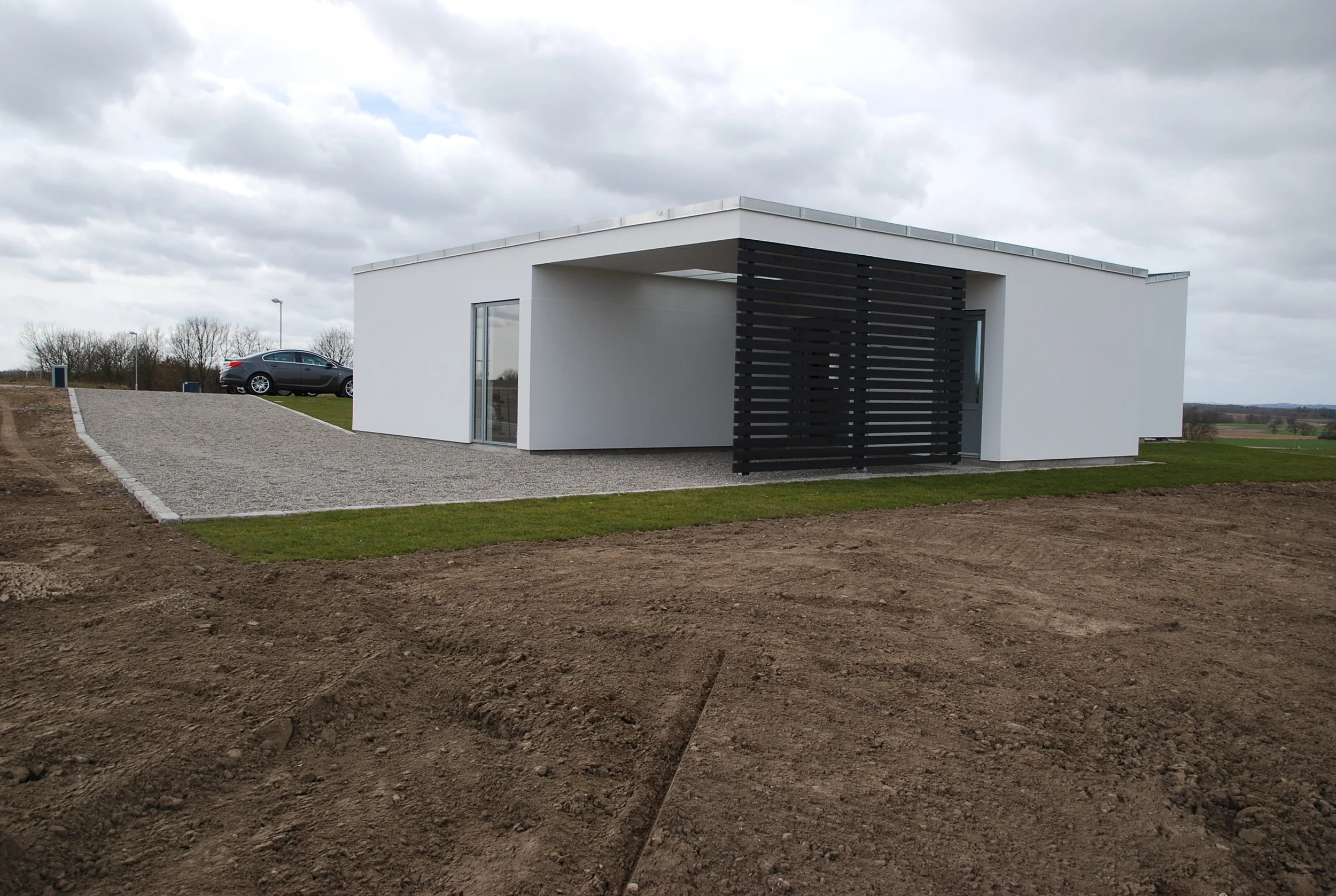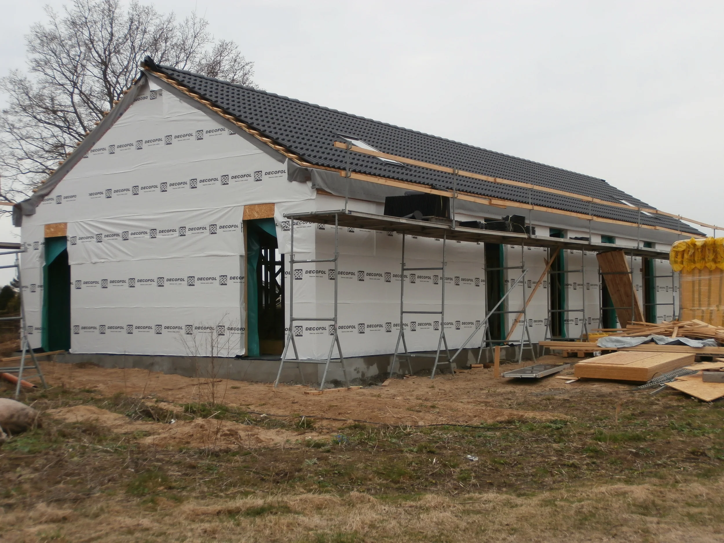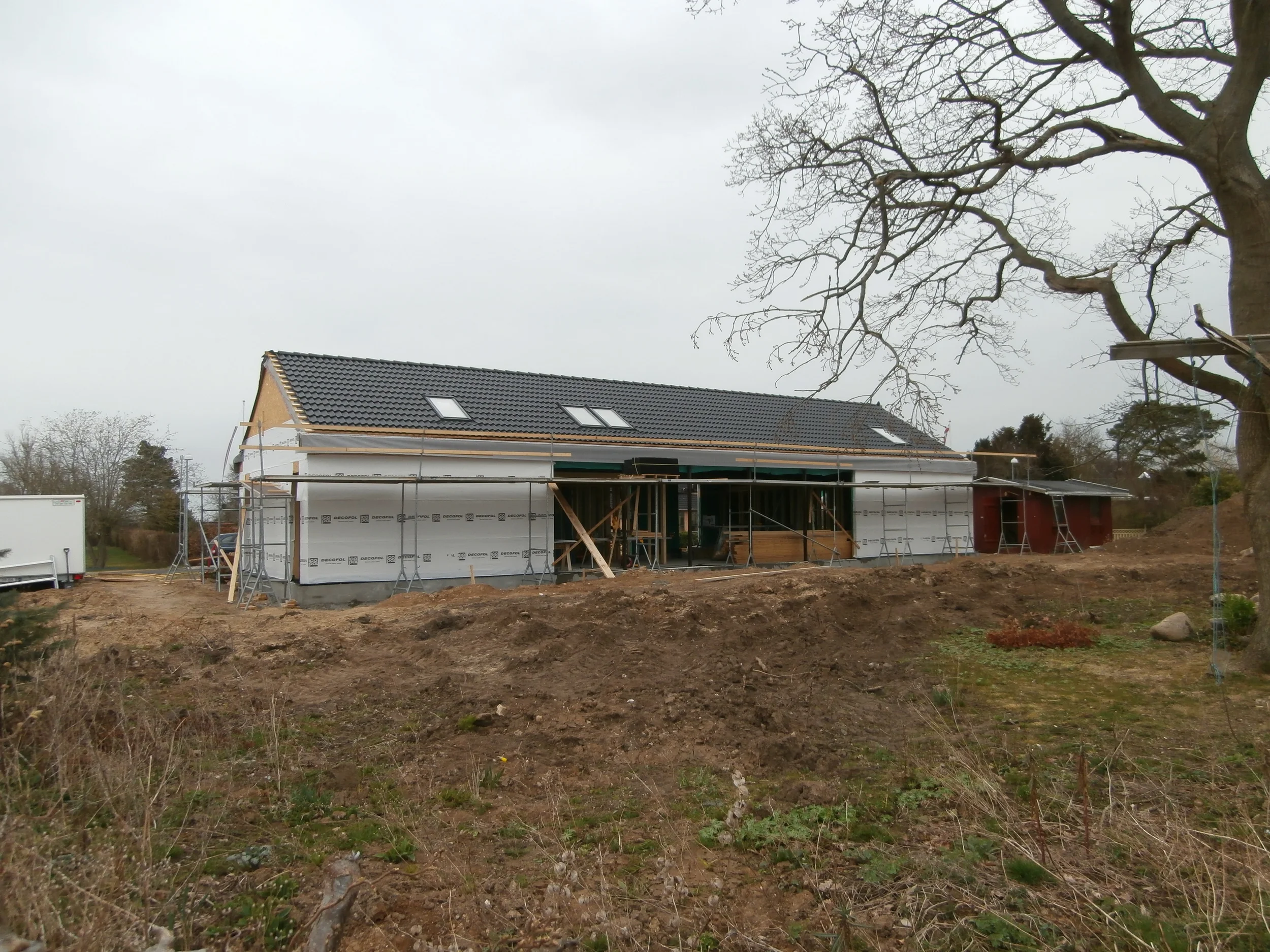 Huset som vi viser byggeplads billeder af her, er nu pr. august 2017 beboet. Se efterfølgende billeder. Huset er opført i træ, afsluttet med facade beklædning af sort malet gran. Dertil sorte vinduer og tagsten. Vi har til huset valgt sorte tagrender og øvrige detaljer ligeledes udført i sort. Så alt i alt et sort hus udefra og hvidt inde. Med rigeligt lys og højt til loftet.