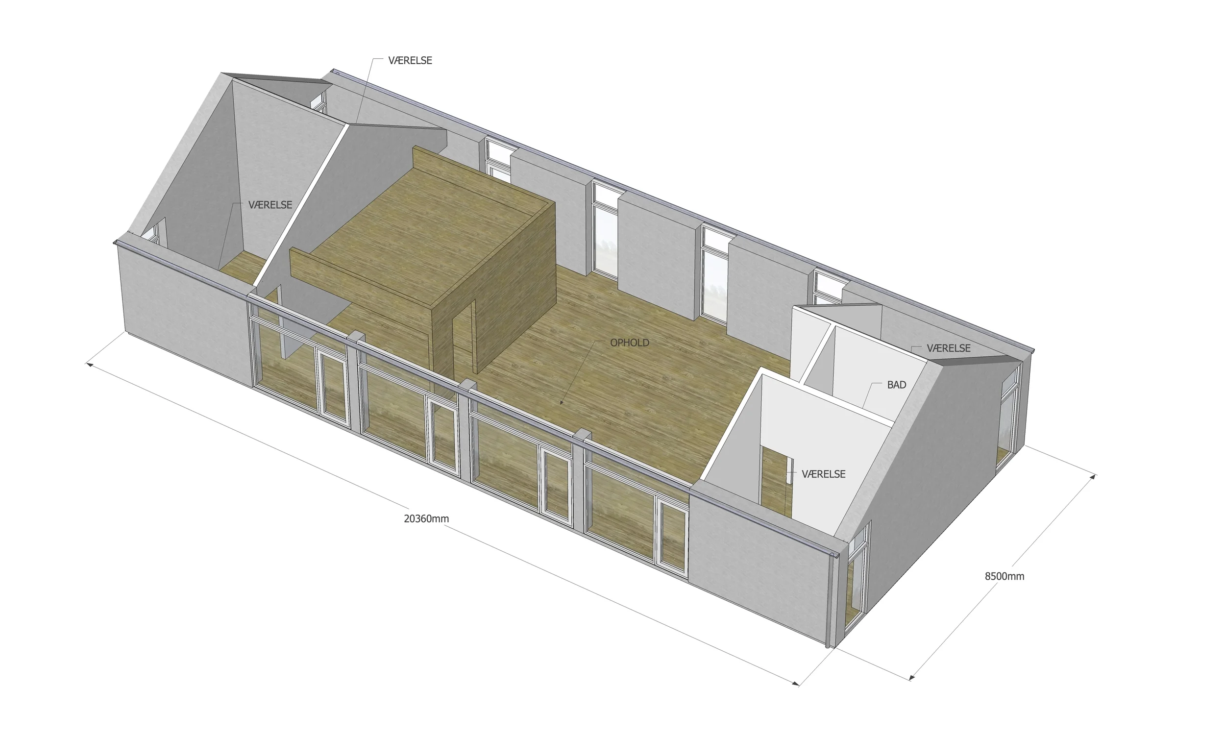 Oneroom husene opføres med en trækonstruktion der omslutter husets indre rum. Dette bevirker at vi er frit stillede med hensyn til indretningen, idet der ikke er behov for bærende indre vægge. Ligeledes giver dette også mulighed for doppelt høje rum, fritstående trapper, gangbroer m.m. alt i alt giver det mulighed for gode visuelle forbindelser mellem etagerne.