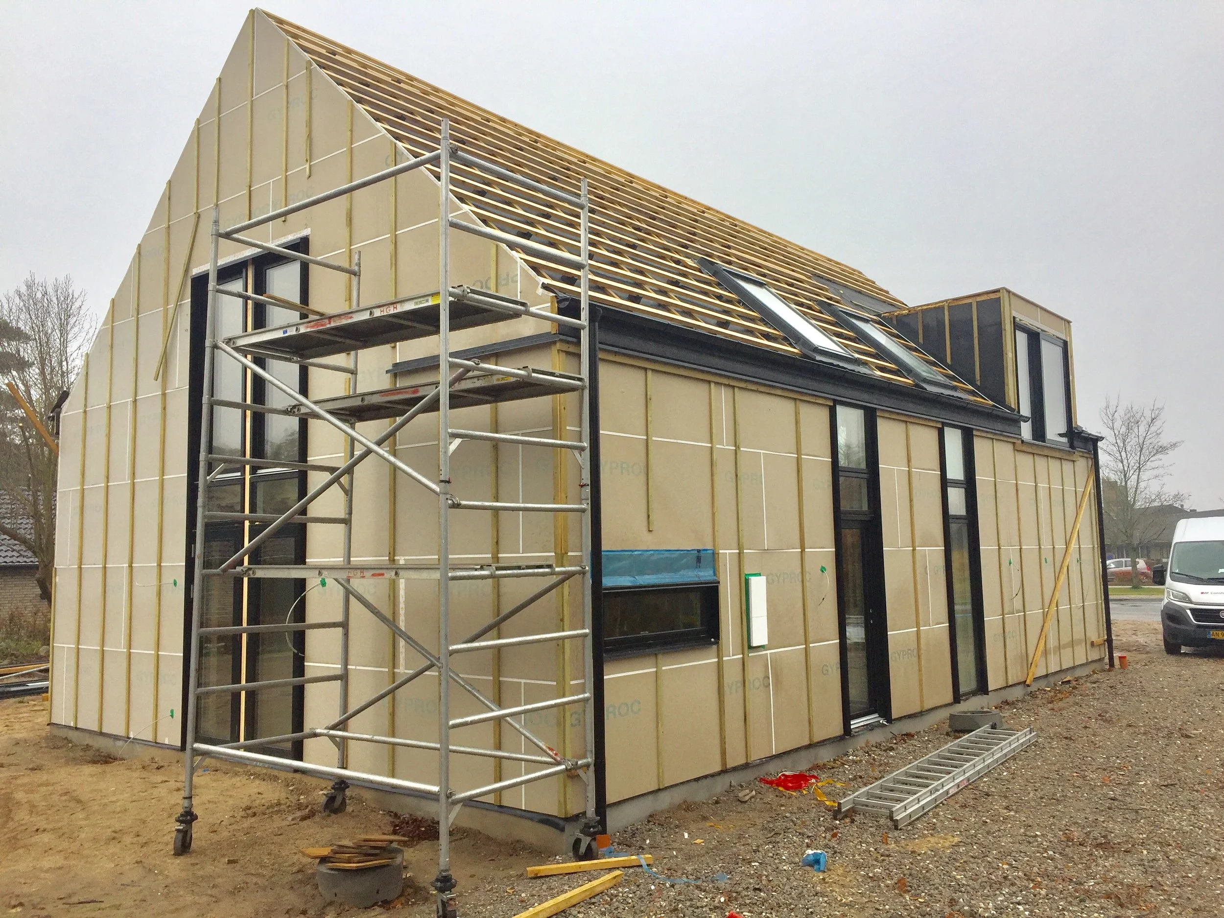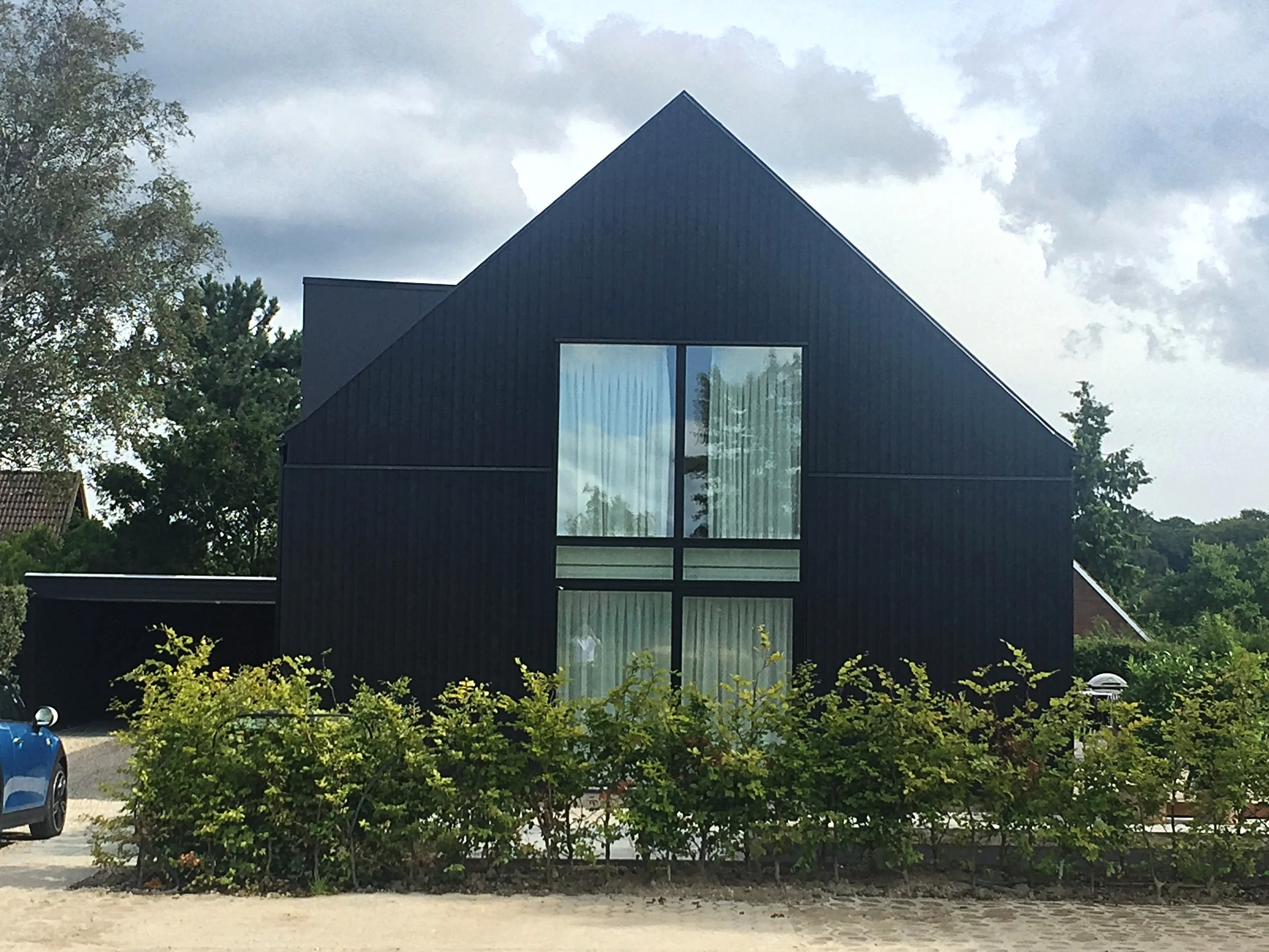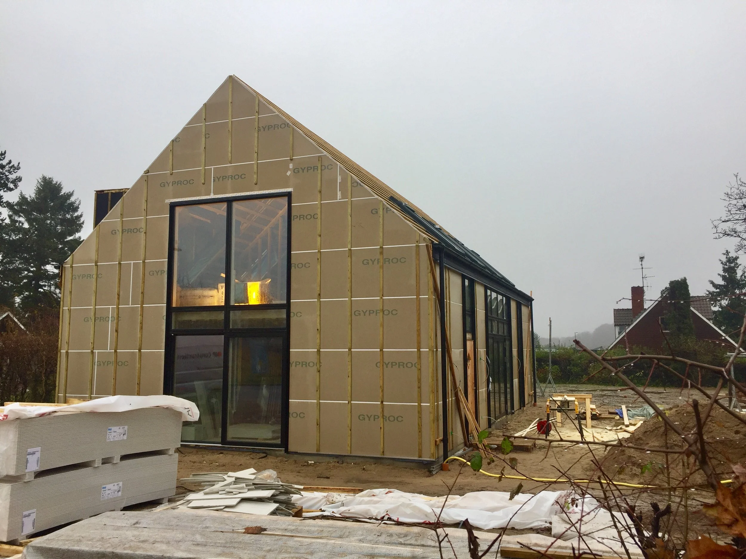 Huset som vi viser byggeplads billeder af her, er nu pr. august 2017 beboet. Se efterfølgende billeder. Huset er opført i træ, afsluttet med facade beklædning af sort malet gran. Dertil sorte vinduer og tagsten. Vi har til huset valgt sorte tagrender og øvrige detaljer ligeledes udført i sort. Så alt i alt et sort hus udefra og hvidt inde. Med rigeligt lys og højt til loftet.