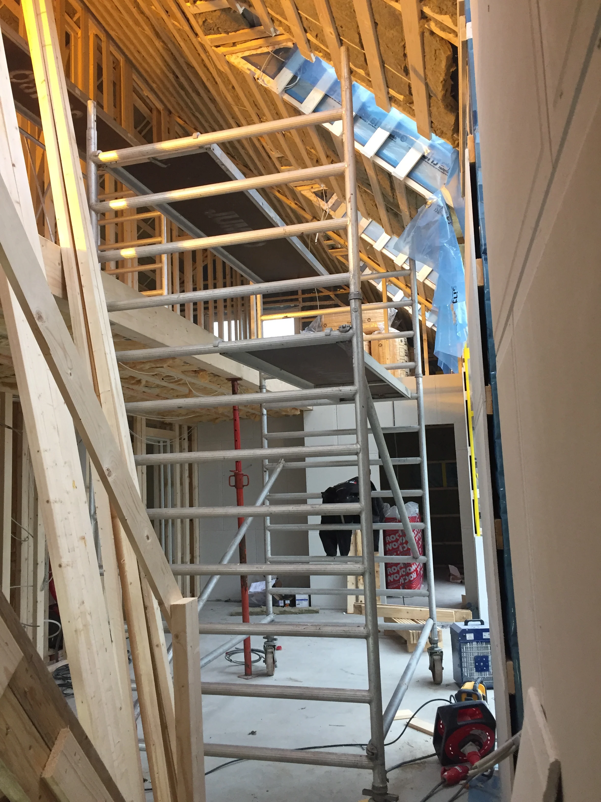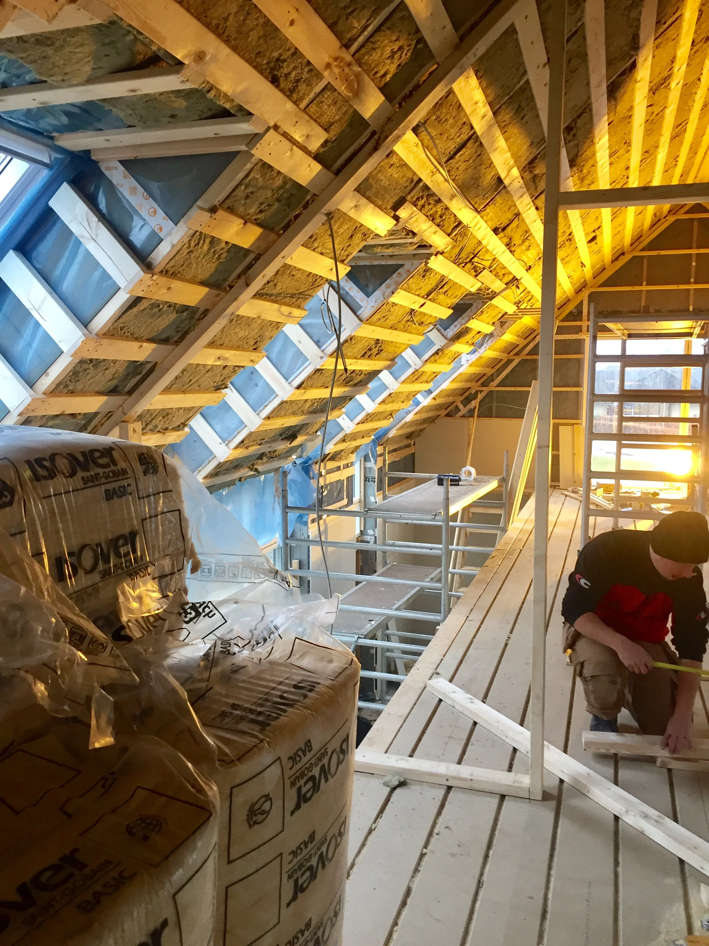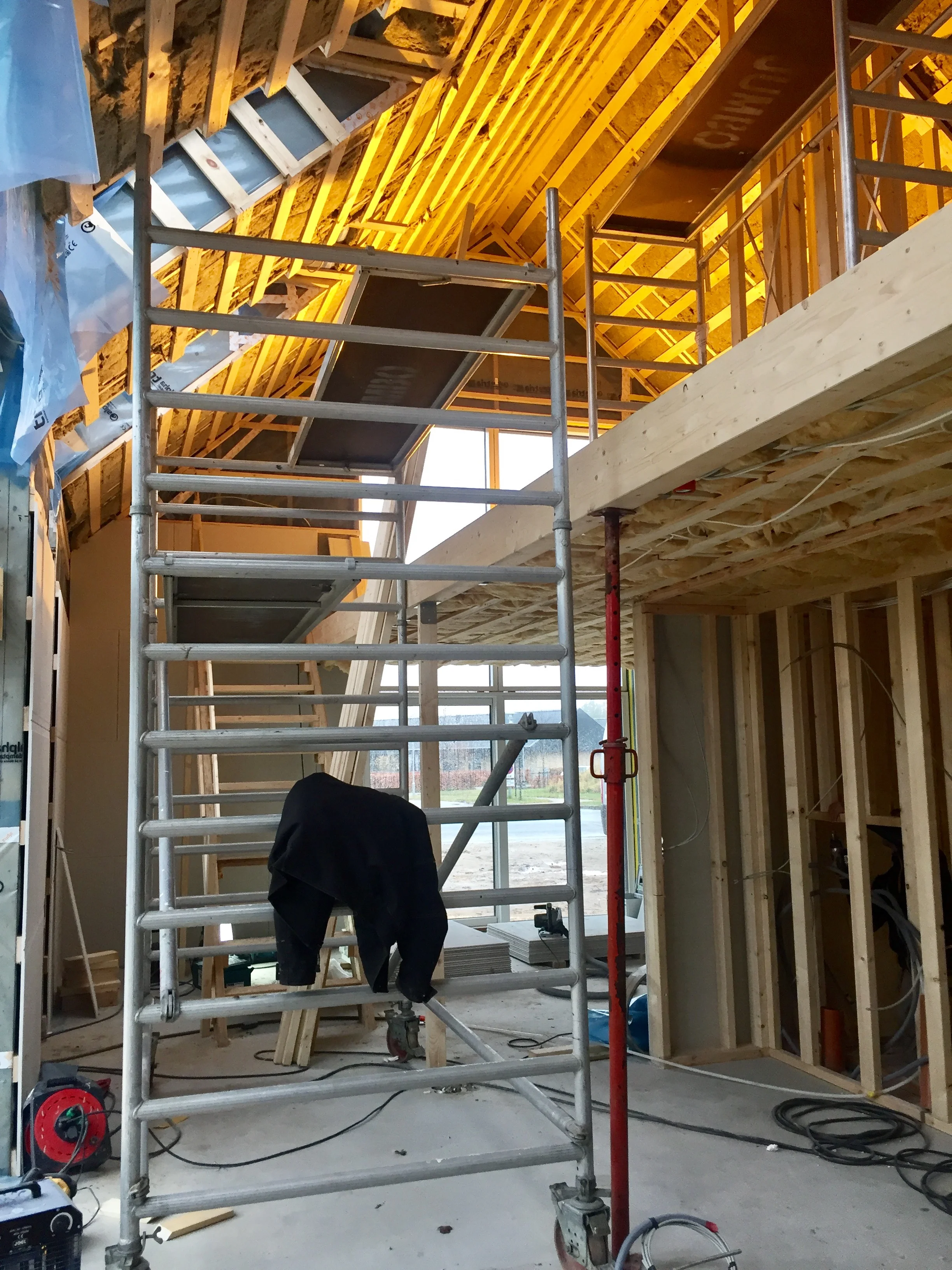 Huset som vi viser byggeplads billeder af her, er nu pr. august 2017 beboet. Se efterfølgende billeder. Huset er opført i træ, afsluttet med facade beklædning af sort malet gran. Dertil sorte vinduer og tagsten. Vi har til huset valgt sorte tagrender og øvrige detaljer ligeledes udført i sort. Så alt i alt et sort hus udefra og hvidt inde. Med rigeligt lys og højt til loftet.